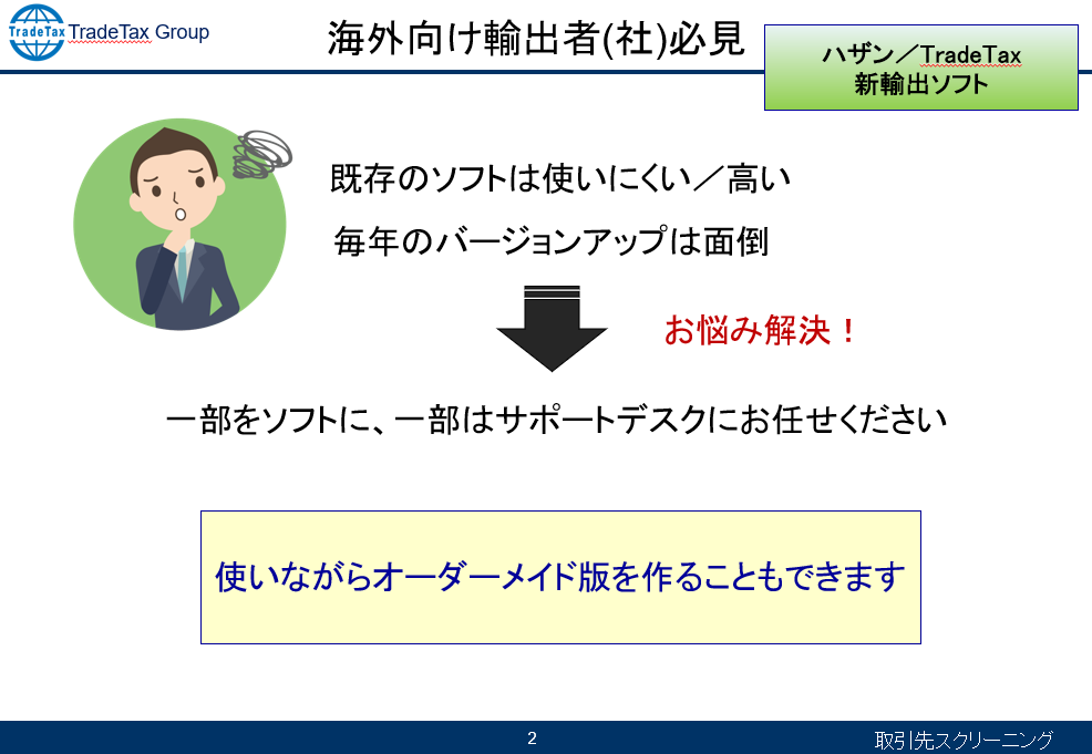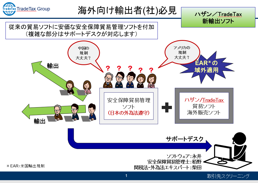 ハザン商会の貿易ソフトに、安全保障貿易管理など、