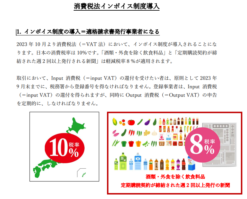 2023年10月より消費税法(=VAT法)において、インボイス制度が導入されることになります。日本の消費税率は10%です。「酒類・外食を除く飲食料品」と「定期購読契約が締結された週2回以上発行される新聞」は軽減税率8%が適用されます。