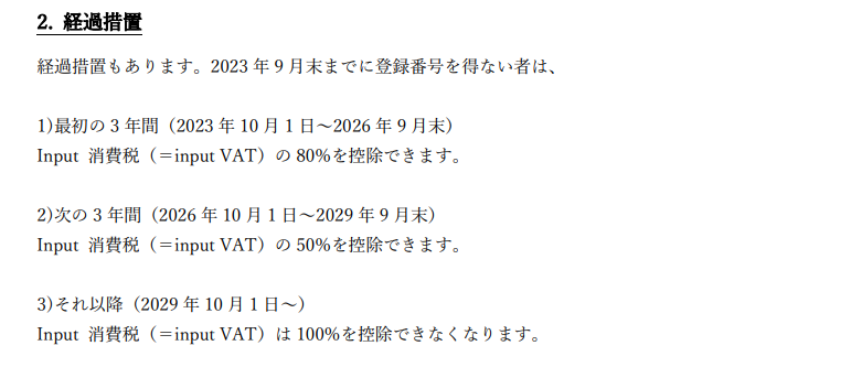 取引において、Input 消費税(=input VAT)の還付を受けたい者は、原則として2023年9月末までに、税務署から登録番号を得なければなりません。登録事業者は、Input 消費税(=input VAT)の還付を得られますが、同時にOutput 消費税(=Output VAT)の申告を定期的に、しなければなりません。