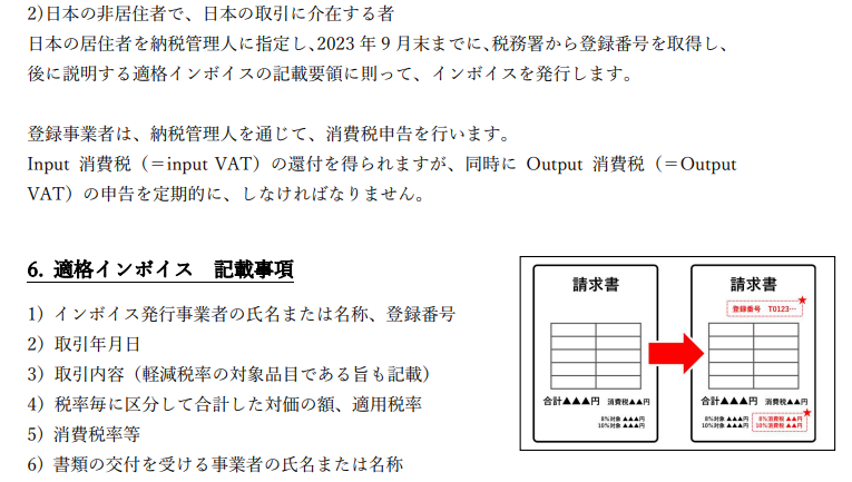 日本の居住者を納税管理人に指定し、2023年9月末までに、税務署から登録番号を取得し、後に説明する適格インボイスの記載要領に則って、インボイスを発行します。