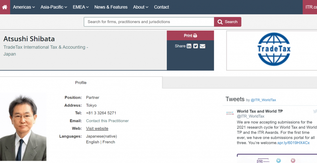 欧州の雑誌ITR (International Tax Review)に、2020年度海外グループの中「アジア・太平洋部門」の一つとして、TradeTax国際税務・会計事務所(所長)が掲載されました。